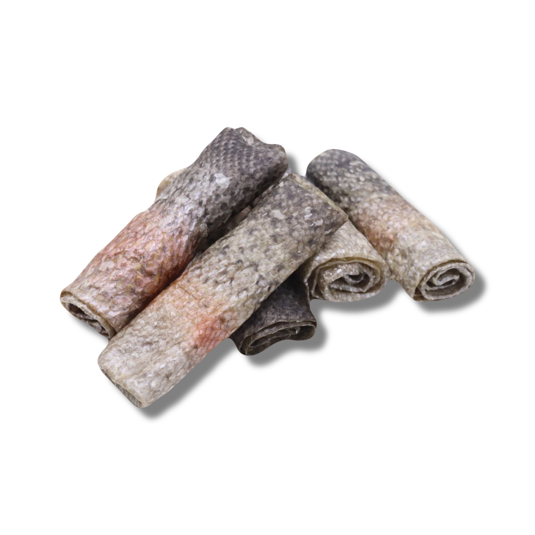 Deze brede kauwrol is gemaakt van 100% zalm- en forelhuid, zorgvuldig opgerold en langzaam luchtgedroogd voor maximale smaak en een stevige textuur. Dankzij het brede oppervlak en de taaie structuur biedt deze roll langdurig kauwplezier en ondersteunt hij de natuurlijke gebitsreiniging. De combinatie van twee hoogwaardige vissoorten maakt dit een premium keuze binnen het natuurlijke kauwassortiment.